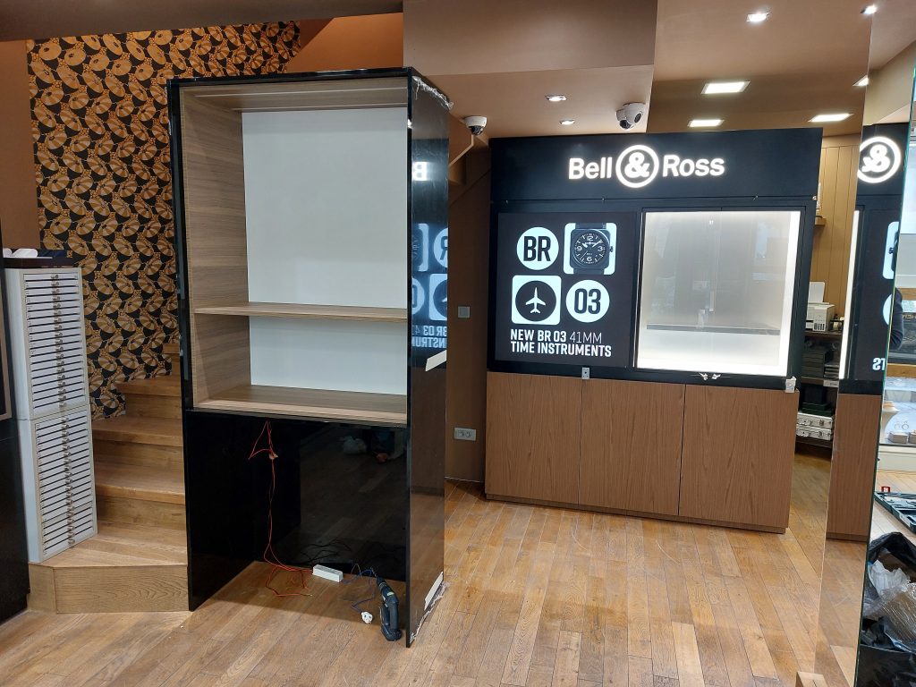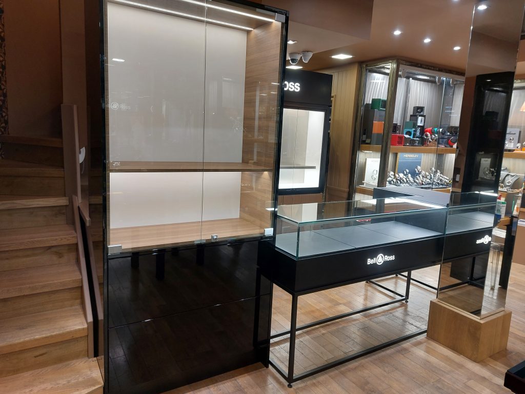 Vitrine personnalisée : Avec un éclairage et une signalétique mettant en valeur la marque Bell & Ross.