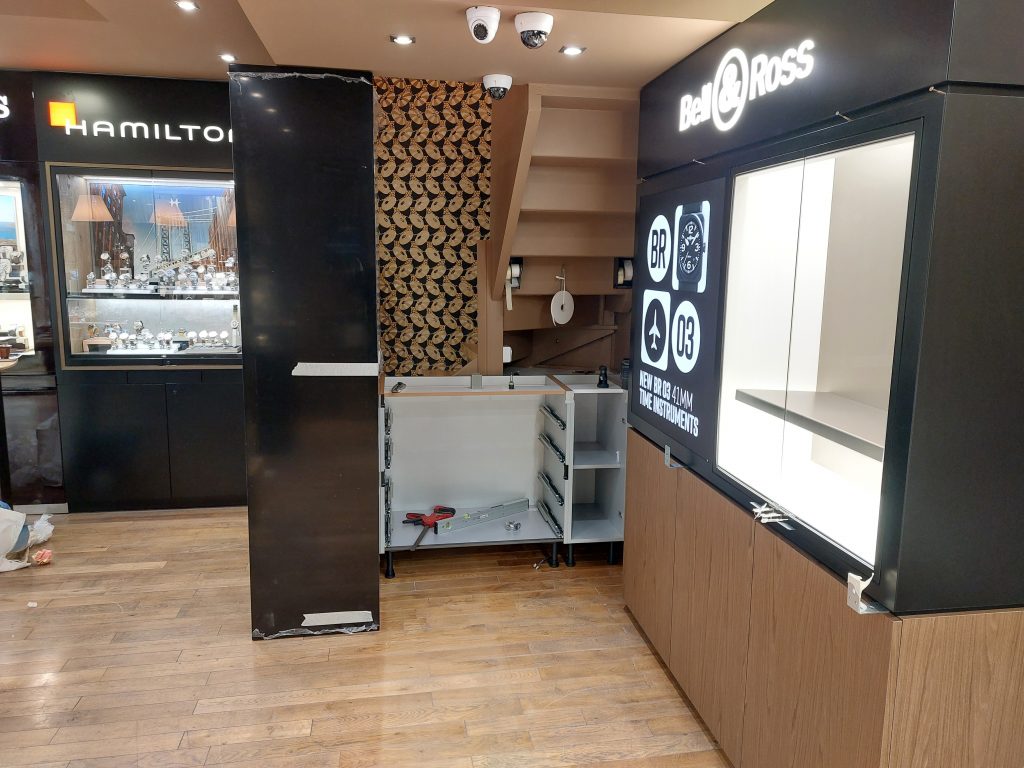Pour cet aménagement, nous avons conçu un ensemble de meubles à la fois esthétiques et adaptés à l’univers de l’horlogerie haut de gamme. Le design a été pensé pour mettre en valeur les produits tout en créant une atmosphère élégante et chaleureuse.