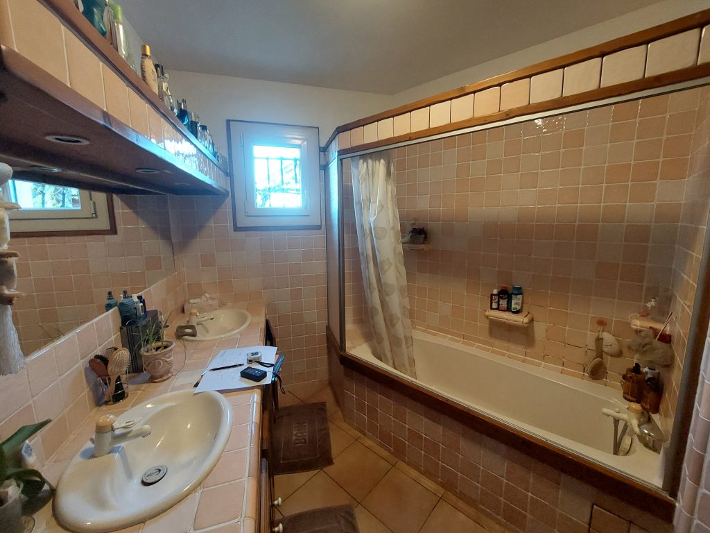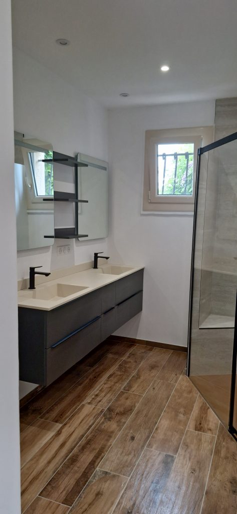 - Lavabo Double Moderne : Un meuble lavabo double suspendu a été installé, offrant un espace de rangement généreux et un design épuré. Les robinets noirs mat apportent une touche de modernité.