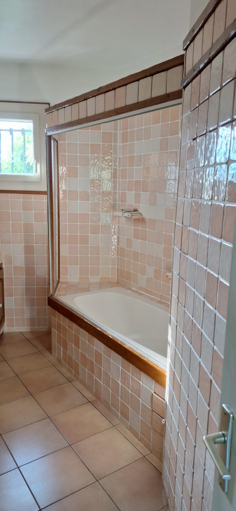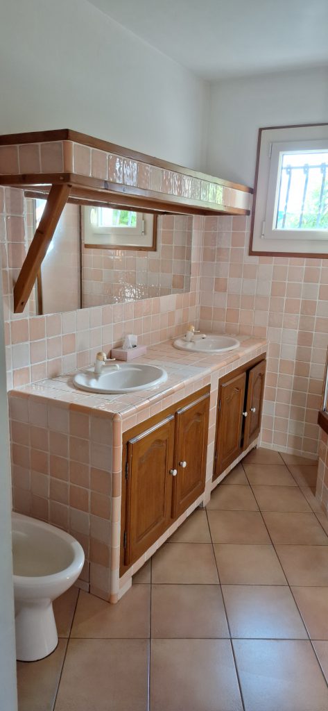 Avant notre intervention, la salle de bain présentait un style désuet avec des carreaux roses, des installations sanitaires anciennes et une disposition peu pratique. Les photos montrent un espace sombre, manquant de modernité et de confort. Le lavabo double était ancien et les espaces de rangement insuffisants, rendant l’utilisation quotidienne peu agréable.
