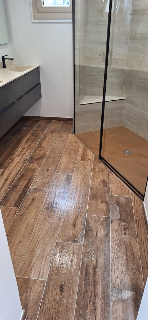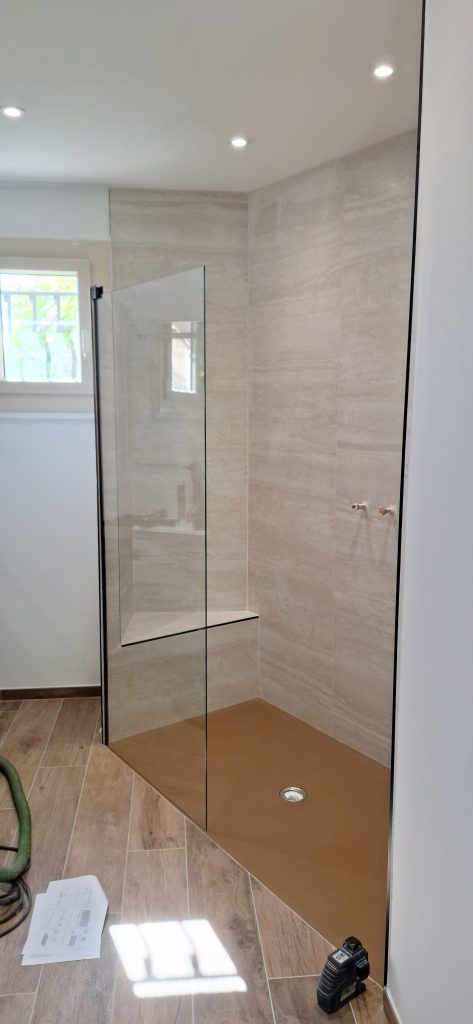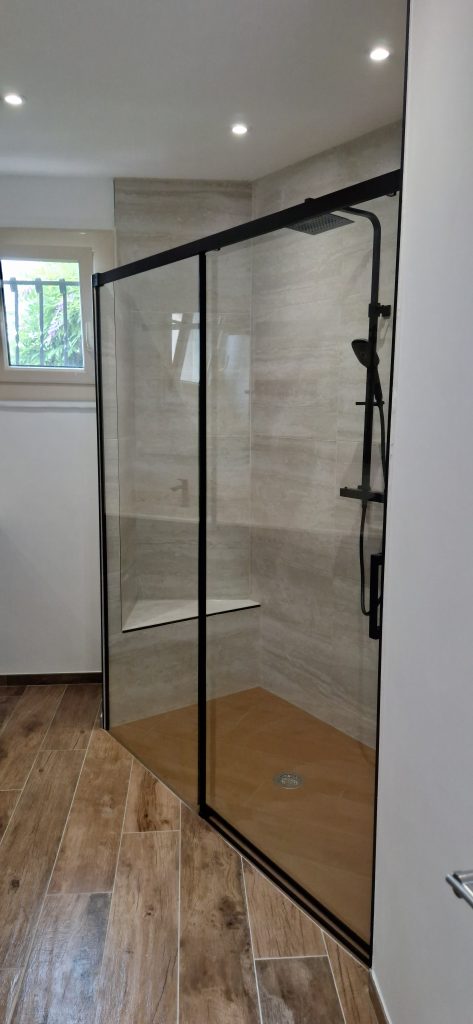 - Douche à l’Italienne : Nous avons installé une douche à l’italienne spacieuse avec des parois en verre et des finitions en métal noir. Le carrelage beige clair apporte luminosité et élégance à l’espace.