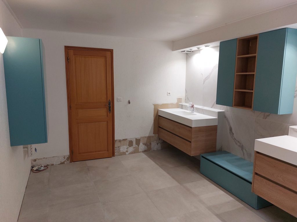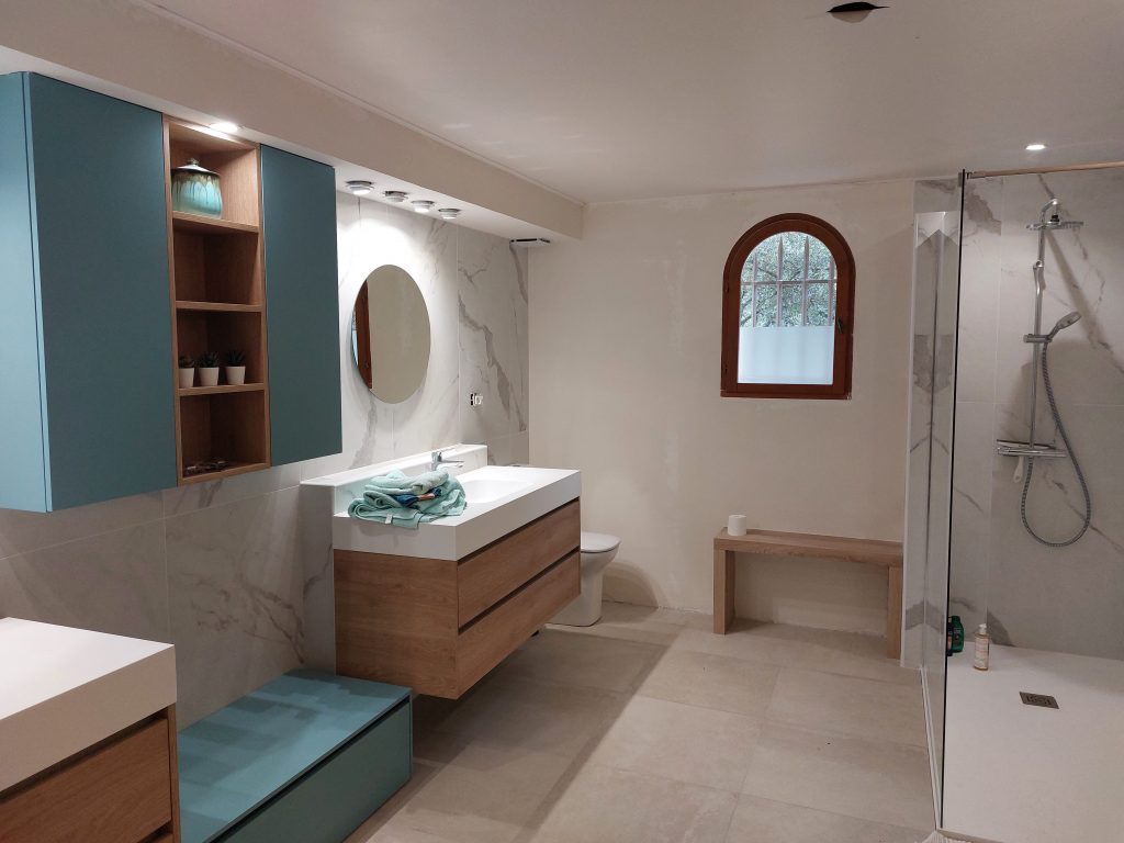 Chez LaCrouzette Agencements situé près de Montpellier, nous sommes fiers de vous présenter notre dernière réalisation : une salle de bain sur-mesure conçue avec des matériaux de qualité, une esthétique épurée, et des éléments de couleur soigneusement choisis.