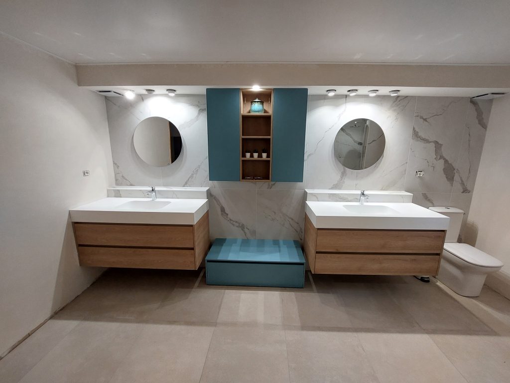 Chaque détail de cette salle de bain a été soigneusement sélectionné pour assurer durabilité et esthétisme. Les plans de travail en quartz offrent non seulement une résistance exceptionnelle mais également une surface lisse et élégante. Les armoires suspendues en bois clair avec des finitions en turquoise ajoutent une touche contemporaine tout en maximisant l’espace de rangement.
